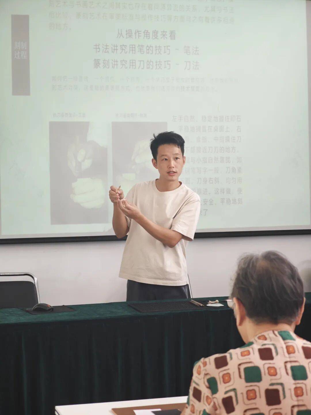 讲座由中国茶叶博物馆绿叶子志愿者、中级工艺美术师徐晓舵老师主讲,他从篆刻的历史渊源切入,深入讲解篆刻的技法精髓。篆刻体验环节,徐老师现场演示篆刻工具使用、字体设计、刀法技巧等,并一对一指导村民创作专属印章。